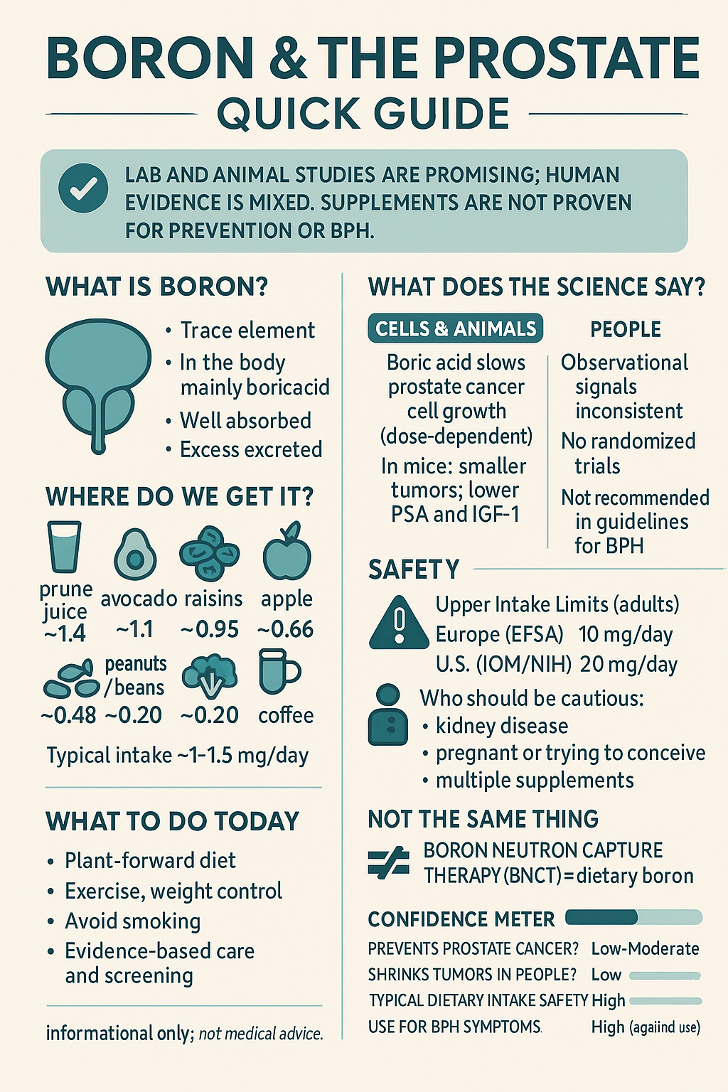 Chronic inflammation is tied to prostate problems (including BPH and cancer). Early research points to boron nudging inflammatory pathways and markers. It’s a plausible reason for interest, but we still need stronger clinical trials.