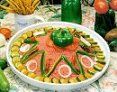 sirve en una fuente honda y sobre el cuscus se colocan las verduras y el pollo,