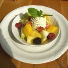 Limpiar, pelar y cortar pequeñas, las peras, manzanas y los plátanos, aromatizar con el kirsch.