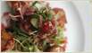 Colocar en cada plato hojas verdes intercaladas o un poco mezcladas con las frambuesas y los crujientes de tocino, esparcir por encima algunas flores de borraja. Poner a un costado, casi cruzado y un poco por encima de la ensalada la bruscheta con queso brie (caliente). Terminar agregando en el borde interno del plato un hilo y gotas de la vinagreta.