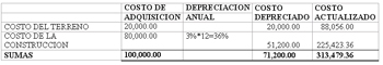 La depreciación por construcción es del 3% anual, por lo tanto si lo multiplicamos por los 12 años, nos da un porcentaje del 36% y es el equivalente a $28,000.00, que se le restaron a los $80,000.00 del costo de adquisición de la construcción, y nos quedan $51,200.00.