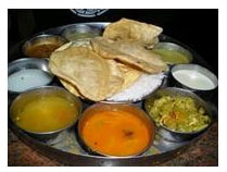 En la foto una combinación de unos 3 puris, arroz, hortalizas secas, un vegetal con salsa, sambar, rasam, dal, requesón, un chutney o pickle, un papad y un dulce y por supuesto los pnes indios coronandoo todo. Este es un thali, o un menú típico de la cocina del sur.