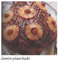 Lave bien el jamón séquelo con un paño limpio y colóquelo en un molde amplio apto par horno. Báñelo con el vino tinto, el vino blanco, la piña y el jugo de naranja, agregue las especies y el papelón hasta que quede cubierto. Llévelo al hervor a fuego medio y cocínelo por una hora y media o dos, retírelo del fuego y déjelo enfriar. Quite el exceso de grasa del jamón y báñelo de nuevo con el vino utilizando una cuchara de madera. Luego frótelo con una mezcla de azúcar y canela molida hasta que lo cubra del todo, dejándole una capa gruesa y rocíelo de nuevo con vino. Coloque el jamón en una bandeja con rejilla, y llévelo al horno precalentado a 170°C-350º F, durante unos 40 minutos, al retirarlo del horno y cúbralo con azúcar y canela, corte trozos de papel encerado y precaliente una plancha a temperatura media alta, coloque los trozos de papel con el lado encerado hacia el jamón y pase la plancha con cuidado, repita esta operación hasta que haya "planchado" todo el jamón. Báñelo con un caramelo ligero y adorne con rodajas de piña, guindas y clavitos de olor.