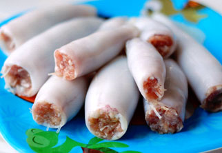 Remojar las setas y flores de lis en agua caliente durante media hora. Descartar los tallos de setas y cualquier parte dura de las flores. Picar finamente. Añadir a la carne de cerdo. Remojar los fideos celofán en agua caliente durante 15 minutos. Picar y agregar media taza de carne de cerdo. Sazone el cerdo con la mezcla de ajo picado, cebolla de primavera (cebollines), sal, pimienta y salsa de pescado. Mezclar bien con las manos. Limpie los calamares a fondo. Deseche la cabeza y el pico y todo el interior del cuerpo. Reserve los tentáculos. Lave el interior de los calamares con agua corriente del grifo, frote y retire la piel manchada. Pique finamente los tentáculos y mézclelos con la carne de cerdo picada. Rellene con la mezcla de cerdo el calamar, el cierre con firmeza con palillos de dientes. Caliente el aceite de maní, 3 -4 cucharadas, en un wok y saltee los calamares a fuego medio durante 5 minutos. Pinche el calamar con pincho fino y continúe cocinando a fuego medio durante otros 10 minutos o más tiempo si el calamar es grande y la mezcla de carne de cerdo necesita más tiempo para cocinar. Córtelos en rodajas finas y colóquelas en una cama de lechuga picada. Sirva caliente con arroz blanco.