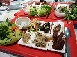 Para comer el primer plato se toma una rebanada de carne se baña en el fondue caliente por unos segundos. Tome un pedazo de papel de arroz mojado, coloque un poco de vegetales sobre el papel de arroz, añada la carne de res cocida y luego lo moje en la salsa. Este procedimiento se repetirá en los seis platos siguientes.