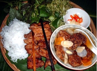 Uno de los paltos mas resaltantes de la cocina de Hanoi en el Bun cha que no es mas que es carne de cerdo a la parrilla servido sobre una cama de fideos de arroz frío y se cubren con algunas hierbas. La carne un trozo de carne de cerdo entreverado con grasa, y se asa a la parrilla en un par de pinzas de bambú. Es marinado en una mezcla de dulce, picante, salado y amargo, Pero, como tantas otras recetas del norte, lo que da al bun cha de Hanói su sabor y aroma característicos son las hierbas de menta.