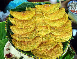 Para la mezcla de los crepes en un tazón una la harina de arroz, el agua, la cúrcuma y la sal. Para preparar el relleno caliente un poco de aceite en una sartén antiadherente y cocine la carne de cerdo y los camarones. Cuando estén bien cocidos, agregue el cebollín y cocine unos minutos, reserve. Añada un poco de aceite en otra sartén, para hacer el crepé muy crujiente. Vierta ½ taza de la mezcla e incline la sartén para extender la masa en un crepe, ponga arriba una porción del relleno. Coloque arriba los brotes de soja y cocine por varios minutos hasta que la parte inferior de la crepe este empezando a tomar color y este muy crujiente. Doble el crepe por la mitad y sáquelo, déjelo que escurra en papel toalla absorbente. Sírvalo con lechuga, hierbas y salsa como acompañamiento.