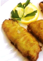 pase el caldo de pollo por un colador fino, y tamice, la harina, el polvo para hornear y la pimienta, para asegurar una pasta de freír quede fina. En un tazón colocar el caldo y mezclarlo con los huevos y la leche, incorpore la harina poco a poco mientras va removiendo con una cuchara de madera hasta logar una pasta tersa; déjela reposar 15 min. Enharine los filetes de pescado y sumérjalos en la preparación anterior, escurra; y échelos en la sartén con bastante aceite bien cliente, fríalos a fuego medio-bajo hasta que estén doraditos, retire y escurrir el exceso de aceite sobre papel absorbente y sírvalos con gajos de limón fresco.