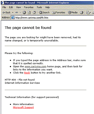 Los errores que se producen al navegar por un site gestionado con Internet Information Server 5.0., por defecto presentan unos mensajes preestablecidos, que son procesados y gestionados por el propio IIS, los cuales nos presentan el código del error que ha ocurrido y una breve explicación de dicho error y enlaces de ayuda, por ejemplo el mensaje típico para el error 404 (página no encontrada), es el siguiente: