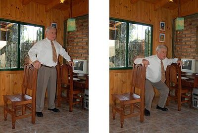 De pie entre 2 sillas, sosténgase de los. respaldos y baje profundamente las