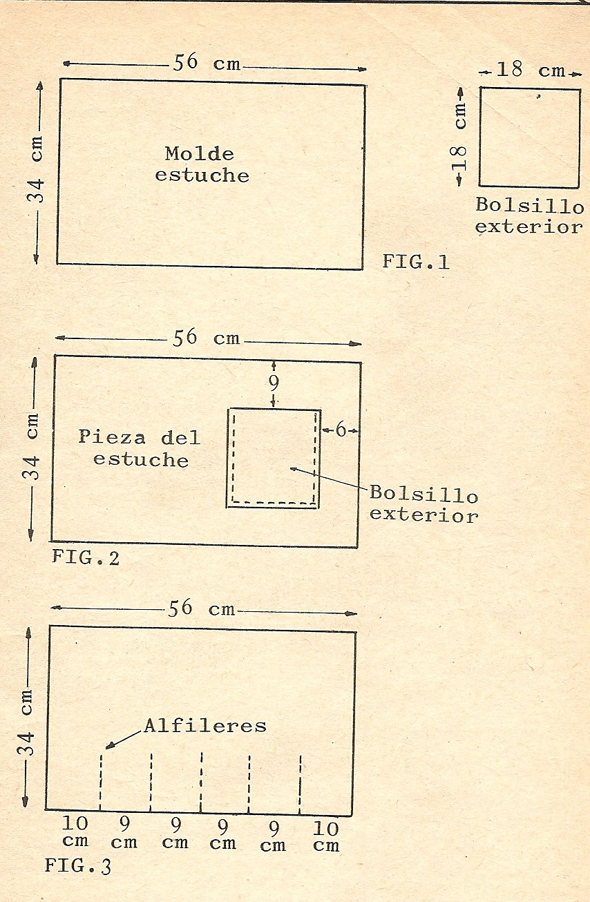Pespuntear los bordes. Cortar un rectángulo de 34 cm de alto x 56 cm de ancho, en tela de forro. Marcar con alfileres las separaciones que indica la figura 3 para determinar el ancho de los bolsillos.