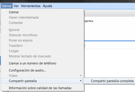 dirigimos al menú “Llamar” y hacemos clic en el ítem “Compartir pantalla”. Allí