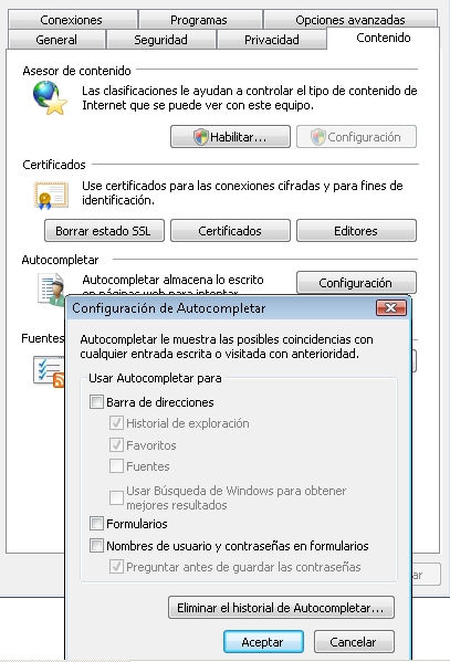 Esto en Internet Explorer puede lograrse ingresando a “Herramientas”, luego a “Opciones de Internet”, en la pantalla que aparece a continuación debemos ir a la solapa “Contenido” y desde allí acceder a las opciones de configuración de la sección “Autocompletar” y quitar el tilde en los casos donde estén activadas funciones de recordar datos.