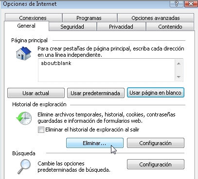 Esto en Internet Explorer se logra ingresando a “Herramientas”, luego a “Opciones de Internet”, en la pantalla que aparece a continuación debemos ir a la solapa “General” y desde allí acceder clic en el botón “Eliminar…” de la sección “Historial de navegación”. En la pantalla que vemos luego, hacemos clic en todos los casilleros y pulsamos “Eliminar”. Luego es conveniente cerrar el navegador.