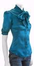 B. Cuello bebé. La delantera no lleva cruce; prende con botones y presillas. Las mangas terminan en puños. Lleva un echarpe de la misma tela, transformable en lazo que rodea a la cintura. Para lucirla dentro o fuera de la pollera o el pantalón, totalmente abotonada o abierta.