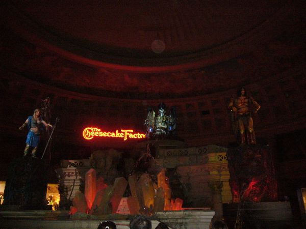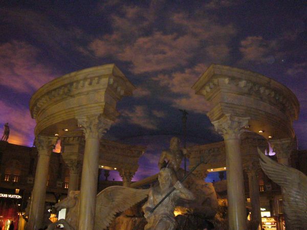 hologramas del emperador que da la bienvenida al visitante cuando se entra por la acera mecánica, una enorme piscina rodeada de enormes estatuas romanas… y todo cubierto por un falso cielo con nubes que cada seis horas anochece para volver a amanecer.