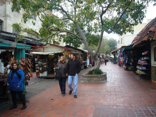 La Olvera Street, que va hacia el norte desde la plaza, ideado en parte como un mercado de aldea pseudo mexicano, aloja varios puestos de comida y artesanía
