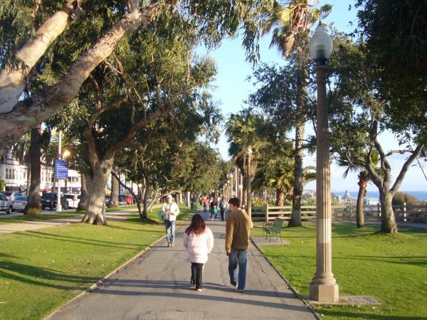 Entre Ocean Ave y la playa –a la altura de Colorado Blvd..-se extiende el parque Palisades (la franja con cipreses a ambos lados a lo largo de la cumbre de los riscos), muy agradable para un paseo y concurrido a la puesta del sol. Durante la noche es hogar de decenas de homeless.