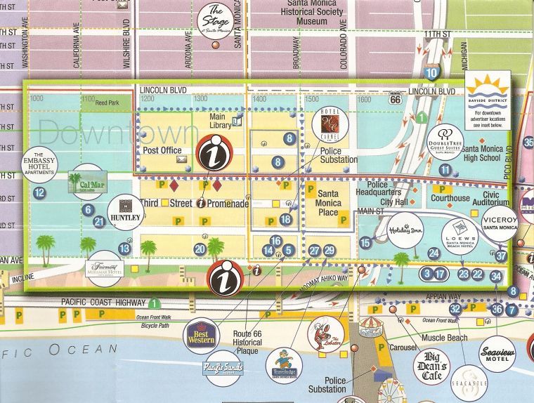 Santa Mónica llega hasta casi 5 km hacia el interior, pero casi todos los lugares interesantes se encuentran a unas cuantas manzanas de la playa.
