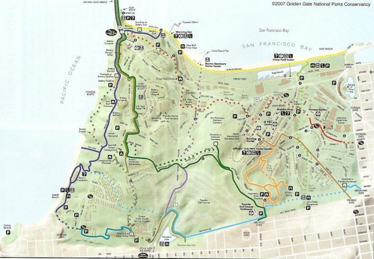 Aquí pueden tomar el autobús gratuito conocido por el nombre de PresidiGo, que los llevará hasta el Golden Gate Bridge atravesando el Presidio y sus bellas vistas, bosques, prados y lugares de interés histórico.