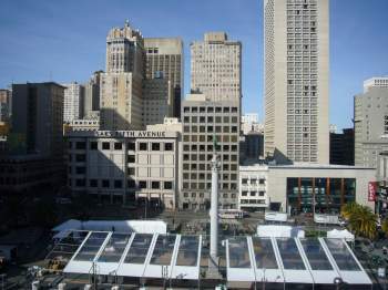 En el octavo piso del 251 de Geary St. se encuentra el restaurante Cheesecake Factory -una muy buena opción gastronómica que prepara todas las variedades imaginables de cheesecakes- que dispone de un gran balcón-terraza con una magnífica vista de la plaza a la que se puede acceder para tomar fotografías aún sin consumir nada en el restaurante.